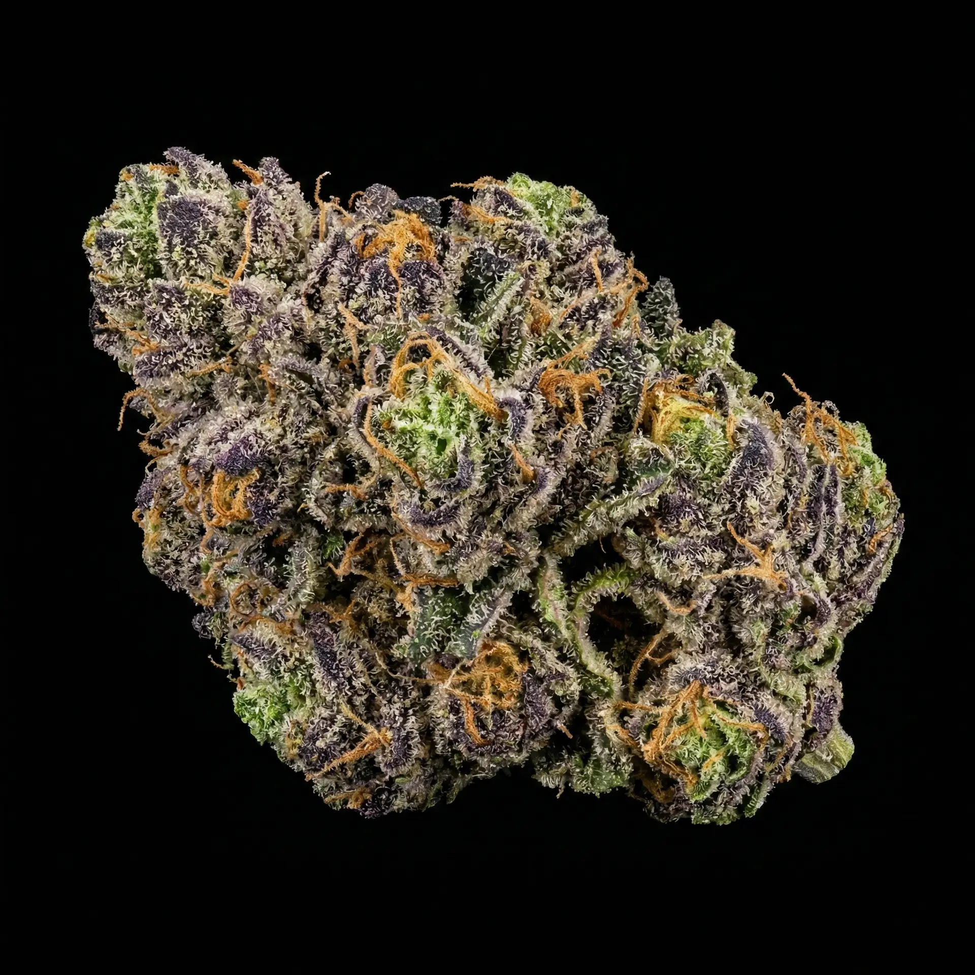 Black Amber stands out immediately for its dense bud structure and heavy trichome coverage. Each nug is carefully cultivated indoors to maximize cannabinoid development and terpene preservation. The buds display rich green tones with subtle amber highlights, giving the strain its name. A thick frost of crystal trichomes coats the surface, reflecting its high THCA percentage and premium cultivation process.